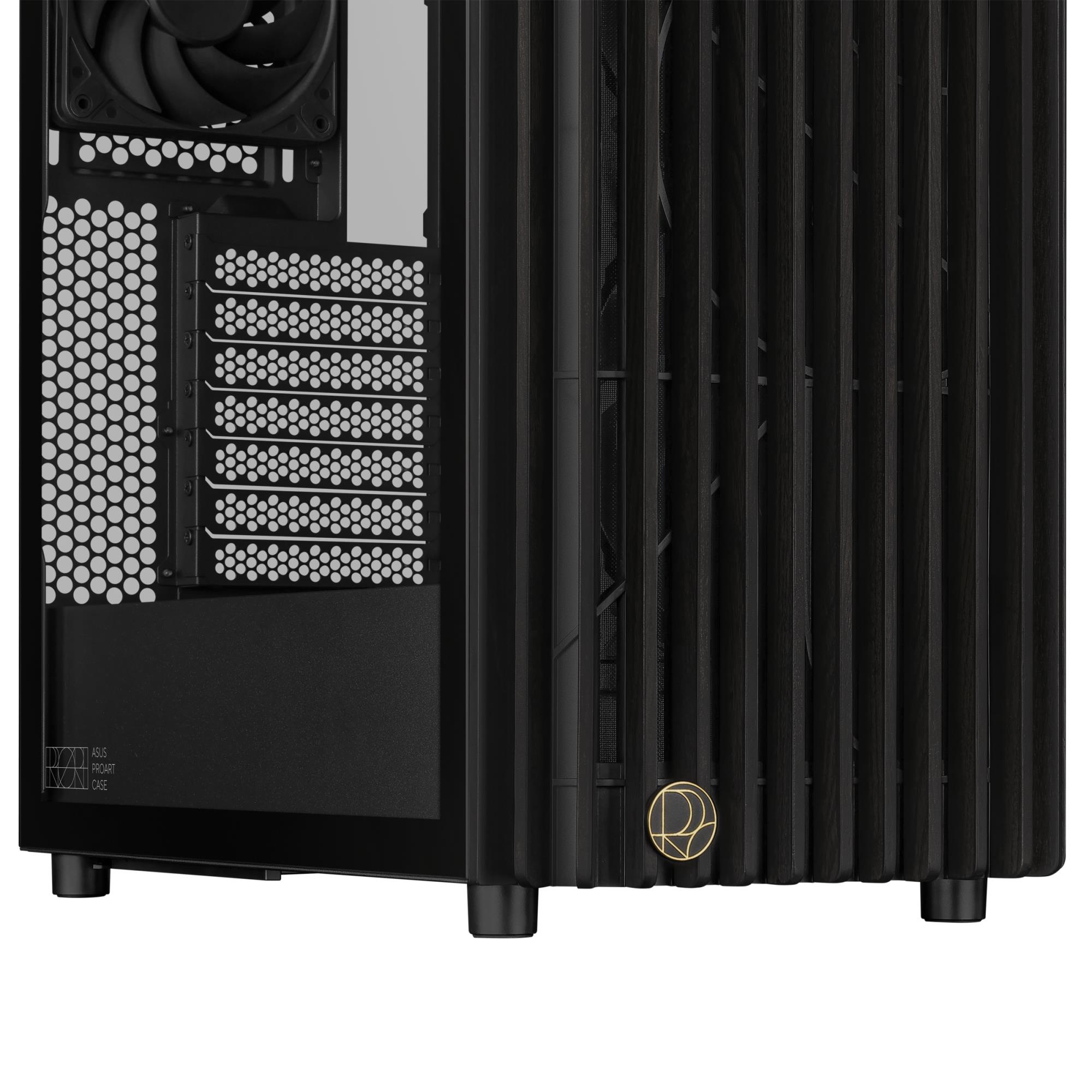 The ProArt PA401 Wood Edition features two pre-installed 160mm front fans and accommodates both horizontal and vertical graphics card mounting.