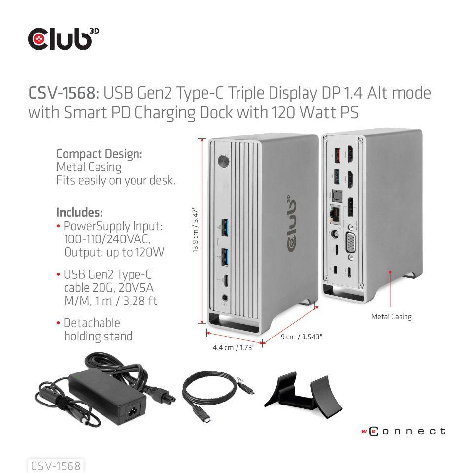 The Club 3D CSV-1568 USB Gen2 Type-C Triple Display DP™ Alt mode + Smart PD Charging Dock with 120 Watt PSU, is an integrated solution combining Video, Data, Power, Ethernet and Audio. It has 4 videos (output 3 videos simultaneously under MST mode) for video transmission, 4 USB data ports (2 USB-A 10G, 1 Type-C 10G, 1 USB-A 5G) for data transmission, 1 USB-A smart charging port for quick charging, 1 Gigabit Ethernet for super fast Ethernet, 2 audio ports (3.5mm audio, Toslink) for enjoying music. Besides, this dock is equipped with dual power jack (Type-C PD Charging or 120W DC power supply). It supports all DP Alt mode1.4/1.2 supported Type-C and Thunderbolt™ 3 host (PC, laptop, mobile phone, etc.) under Windows and under MacOS X based on Intel you will only get limited SST Function or Single display Only.